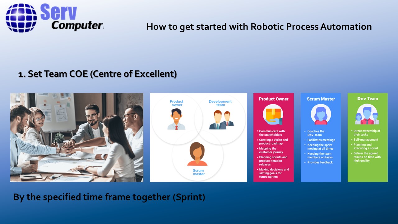 การนำ RPA เข้าไปใช้ในธุรกิจ ให้ประสบความสำเร็จ ไม่ใช่การจ้าง หรือหาทีมพัฒนา RPA เข้ามาพัฒนา เพียงเท่านั้น แต่จะต้องมี หลายภาคส่วนเข้ามาช่วยกัน Design Process จาก Process เล็กๆที่เป็นแค่ Job งานในแต่ละวัน ต่อยอดเป็น Process ของแผนก จนถึงเป็น ภาพรวมทั้งองค์กร และคำนึงถึง พนักงานที่มีหน้าที่รับผิดชอบใน Process ต่างเหล่านั้น ที่จะต้องมีการ Up Skill ขึ้น ซึ่งเราได้ สรุปเป็นขั้นตอน สูตรสำเร็จดังนี้
