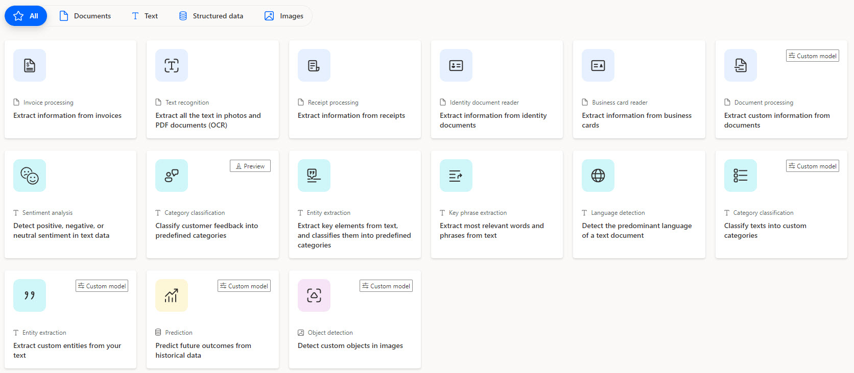 ตัวอย่าง AI Builder และ Standard Model ที่เตรียมไว้ให้นักพัฒนาเลือกใช้งาน