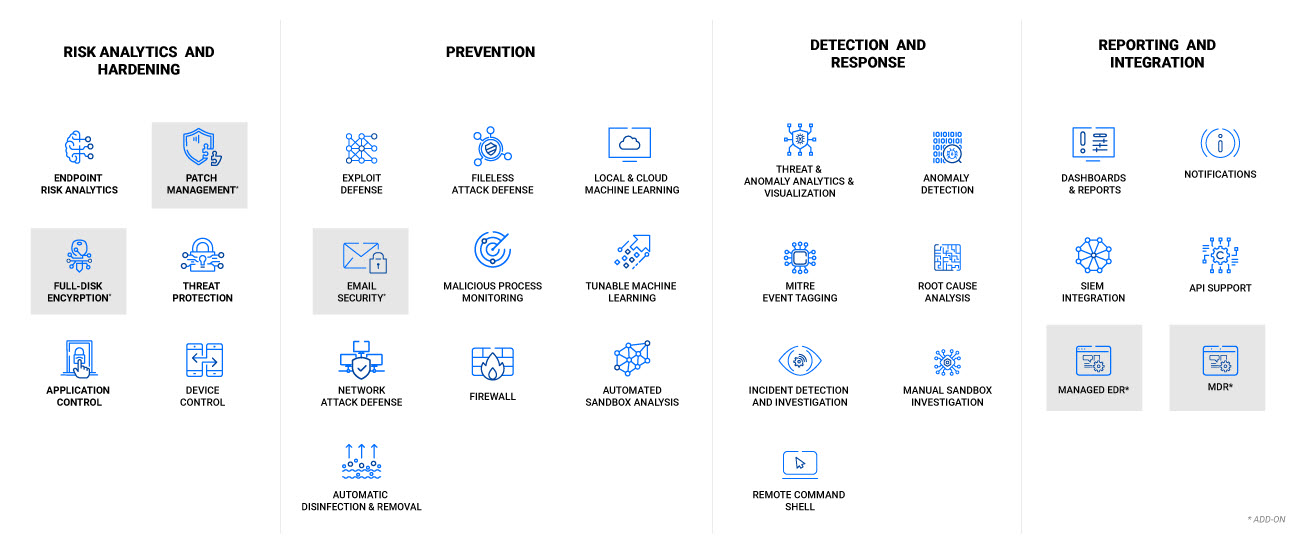 การจัดการแบบรวมศูนย์ (Centerization on Cloud and On Premise): โซลูชันนี้มีคอนโซลกลางสำหรับจัดการความปลอดภัยบนอุปกรณ์ทั้งหมดบนเครือข่าย รวมถึง เดสก์ท็อป แล็ปท็อป เซิร์ฟเวอร์ และ VM (Virtues Machine) ช่วยให้การดูแลระบบง่ายขึ้นและประหยัดเวลาและทรัพยากร