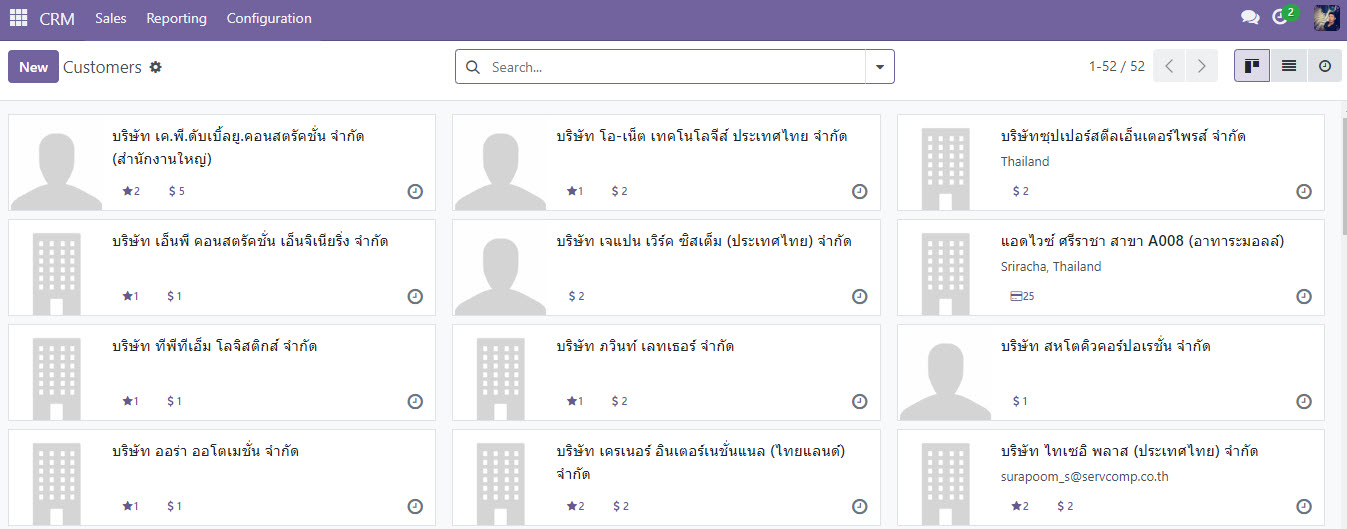 1. การจัดการรายชื่อลูกค้า (Contacts) Module CRM ใน Odoo ช่วยรวบรวมข้อมูลรายชื่อลูกค้าไว้ในที่เดียว ประกอบด้วยชื่อ ที่อยู่ หมายเลขโทรศัพท์ อีเมล และข้อมูลอื่นๆ ที่เป็นประโยชน์ นอกจากนี้ยังสามารถแสดงประวัติการติดต่อกับลูกค้าแต่ละรายได้อย่างละเอียด