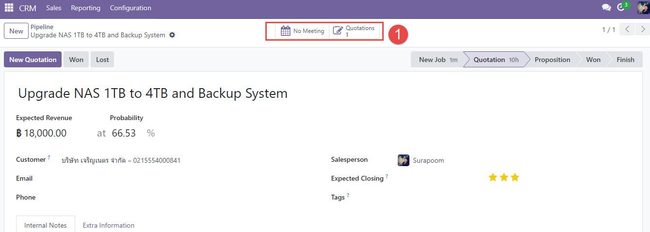 2. การจัดการโอกาสทางการขาย (Opportunities) เมื่อมีลูกค้าที่สนใจสินค้าหรือบริการ พนักงานขายสามารถสร้าง Opportunity ในระบบ CRM เพื่อบันทึกรายละเอียดของโอกาสทางการขายดังกล่าว รวมถึงขั้นตอน/สถานะของการขาย ซึ่งช่วยให้ติดตามได้ง่ายขึ้น