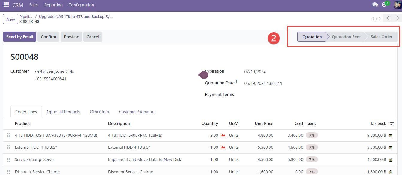 4. การจัดการคำสั่งซื้อ (Sales Orders) เมื่อโอกาสทางการขายสำเร็จ พนักงานขายสามารถสร้างคำสั่งซื้อ (Sales Order) จากภายในโมดูล CRM ซึ่งจะส่งข้อมูลไปยังโมดูลการขายและการบริการของ Odoo ต่อไป ทำให้การทำงานต่อเนื่องกันอย่างราบรื่น