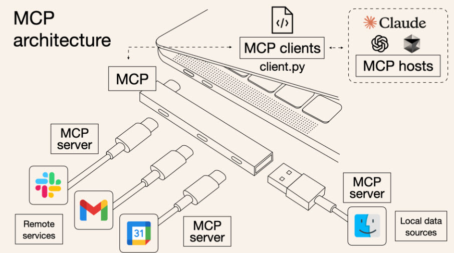 หนึ่งในเทคโนโลยีที่ช่วยให้สิ่งนี้เกิดขึ้นคือ Model Context Protocol (MCP) ซึ่งพัฒนาโดย Anthropic (บริษัทผู้สร้าง Claude AI) โดย MCP เป็น มาตรฐานใหม่ที่ช่วยให้ AI ติดต่อกับแหล่งข้อมูลภายนอกได้อย่างปลอดภัยและมีประสิทธิภาพ