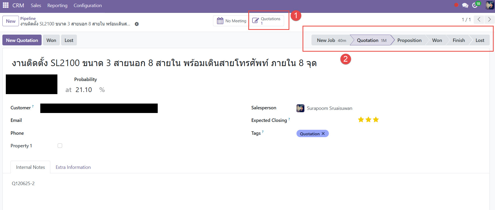 จากข้อมูล Lead หรือ Project ทีม Sale สามารถจัดทำ ใบเสนอราคา ได้โดยตรงจาก Odoo CRM