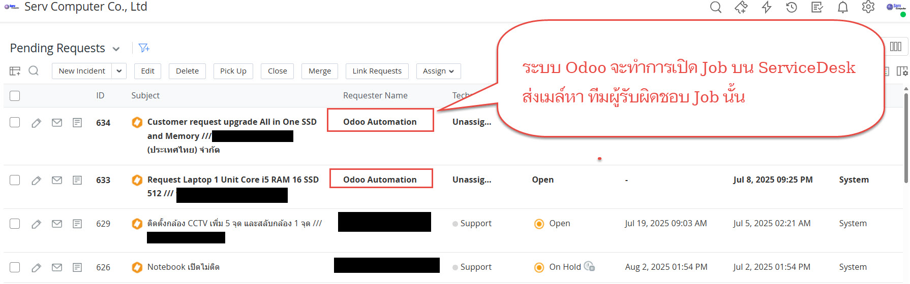 เมื่อลูกค้าทำการ เปิด PO (Purchase Order) ระบบ Odoo CRM จะทำการเชื่อมโยงข้อมูลและดำเนินการในส่วนถัดไปโดยอัตโนมัติ และระบบ CRM บน Odoo จะทำการเปิดงาน (Project Task/Ticket) บน ServiceDesk โดยอัตโนมัติ โดยอ้างอิงจากข้อมูลใน PO ที่ได้รับ พร้อมกันนั้น ระบบจะทำการส่งอีเมลแจ้งเตือน ไปยังหน่วยงานหรือทีมที่รับผิดชอบใน Project นั้นๆ โดยอัตโนมัติทันที
